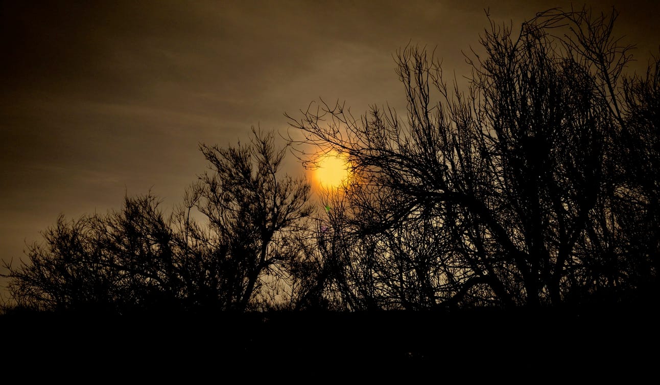 After flying at around 380’ (or 115 meters) above ground level, I returned to land, only to discover that the outlined silhouettes of the trees in front of the sun seemed to reach out, circle the sun, almost to touch it, or even pierce it with their branches. I had set the camera’s configuration to low ISO values, cool color settings and the contrast was nearly monochromatic. In reality, the day was dark, but not that dark!