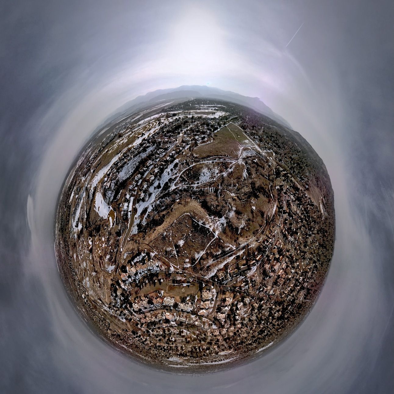 The day itself, despite the cold, was pleasant. Without reflection, it could seem like the status was still quo and all was normal. But within the normal sights and sounds of Hutchinson Park in Lakewood, Colorado, I could see the potential for a message of hope during a time of crisis. That message wasn’t meant to be isolated, or contained only within itself. For that, I try to portray an image of self-containment with the “Tiny Planet” panoramas. The full 360° vista of the landscapes surrounding the drone become converted from cartesian coordinates to polar coordinates to transform and enclose the entire vista: first within an outer frame of the image, then, within an inner sphere depicted in the image itself.
