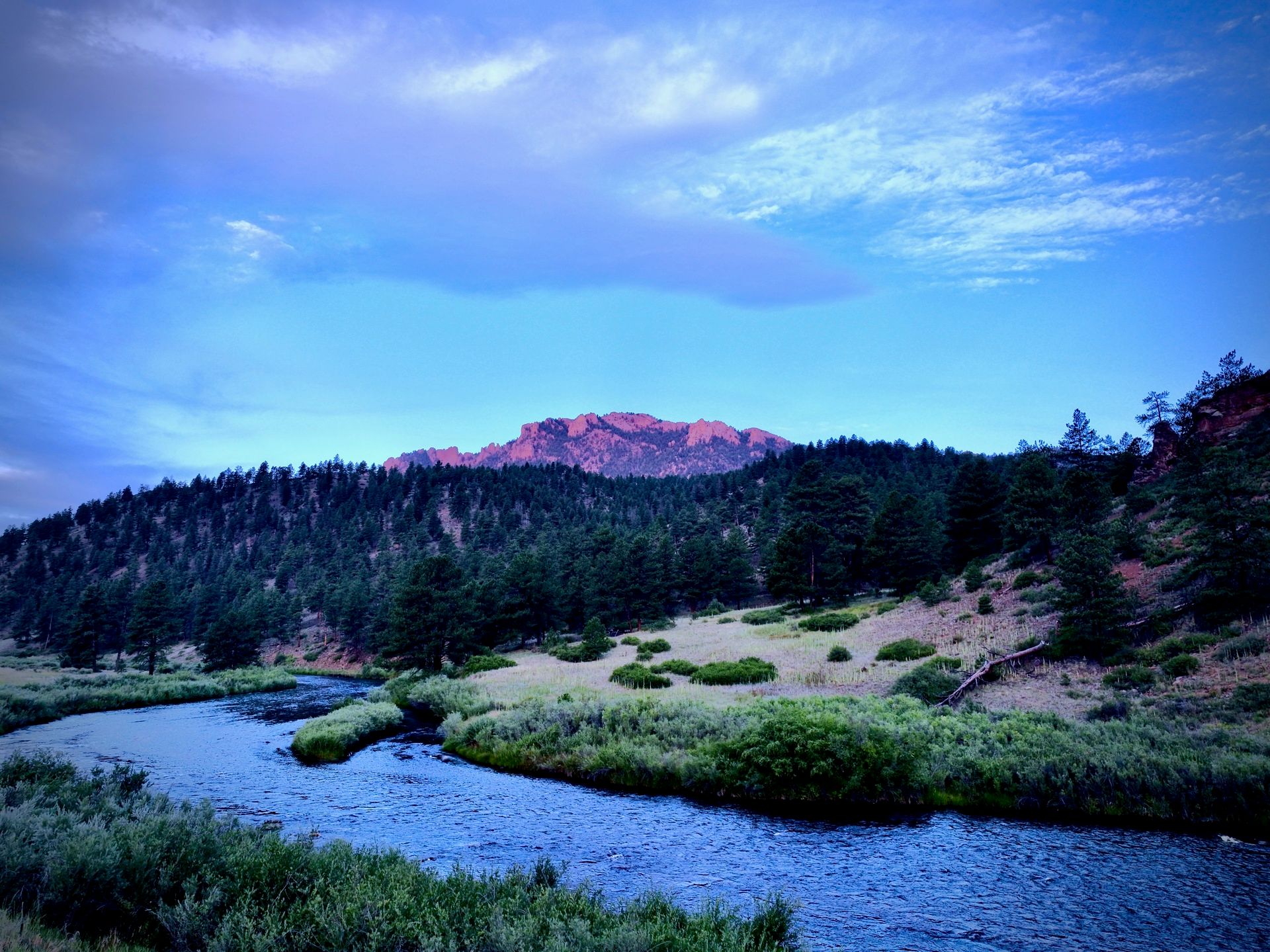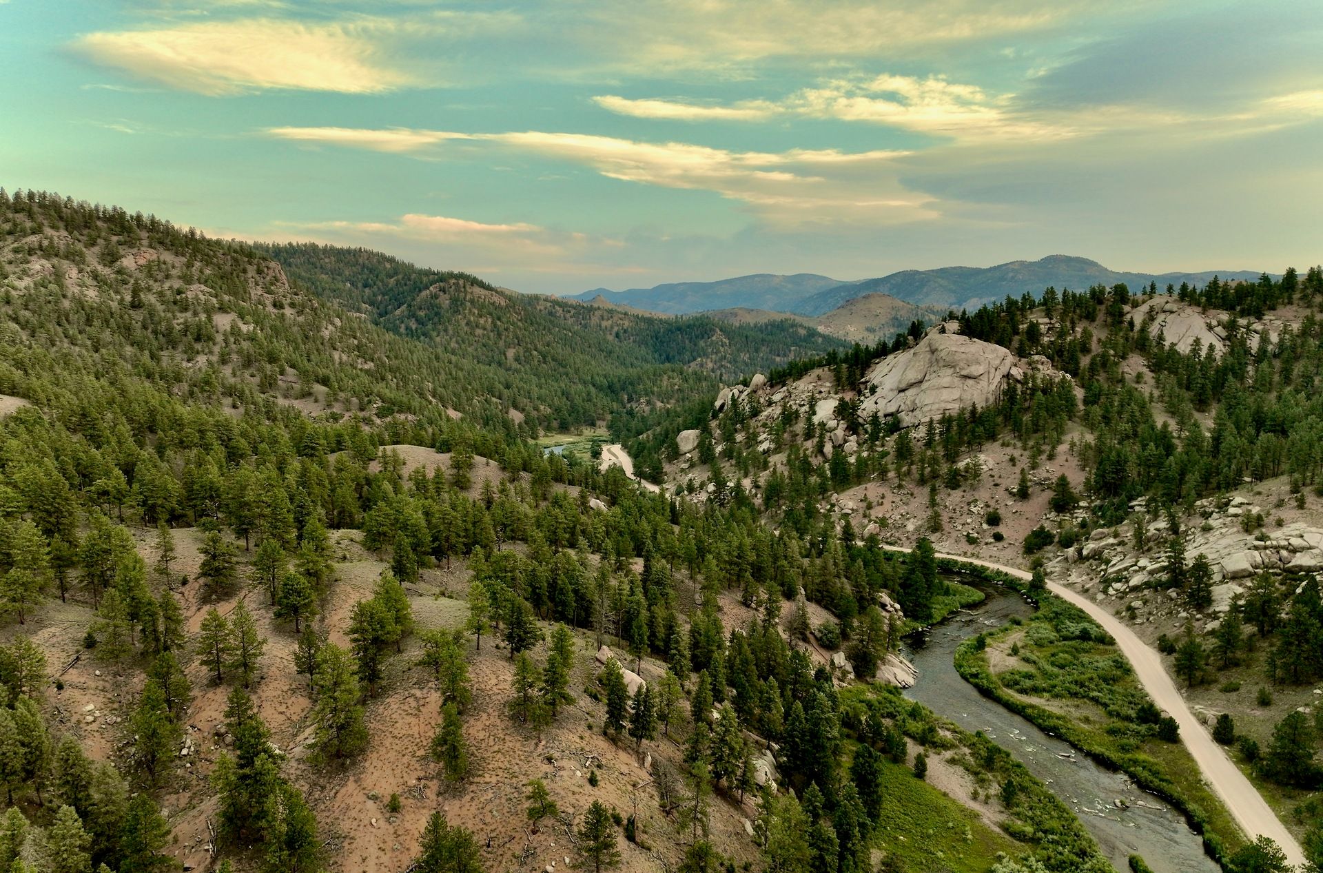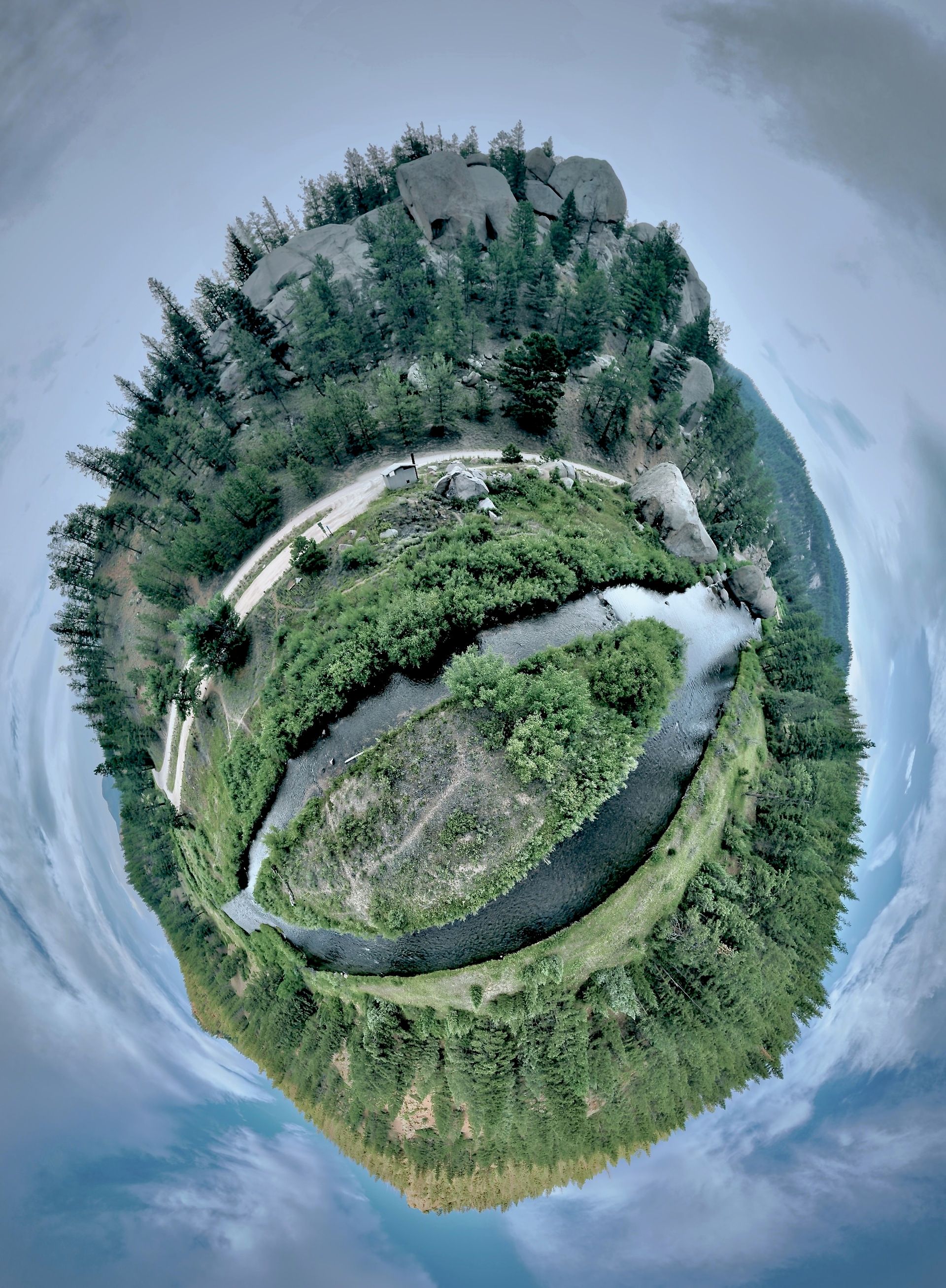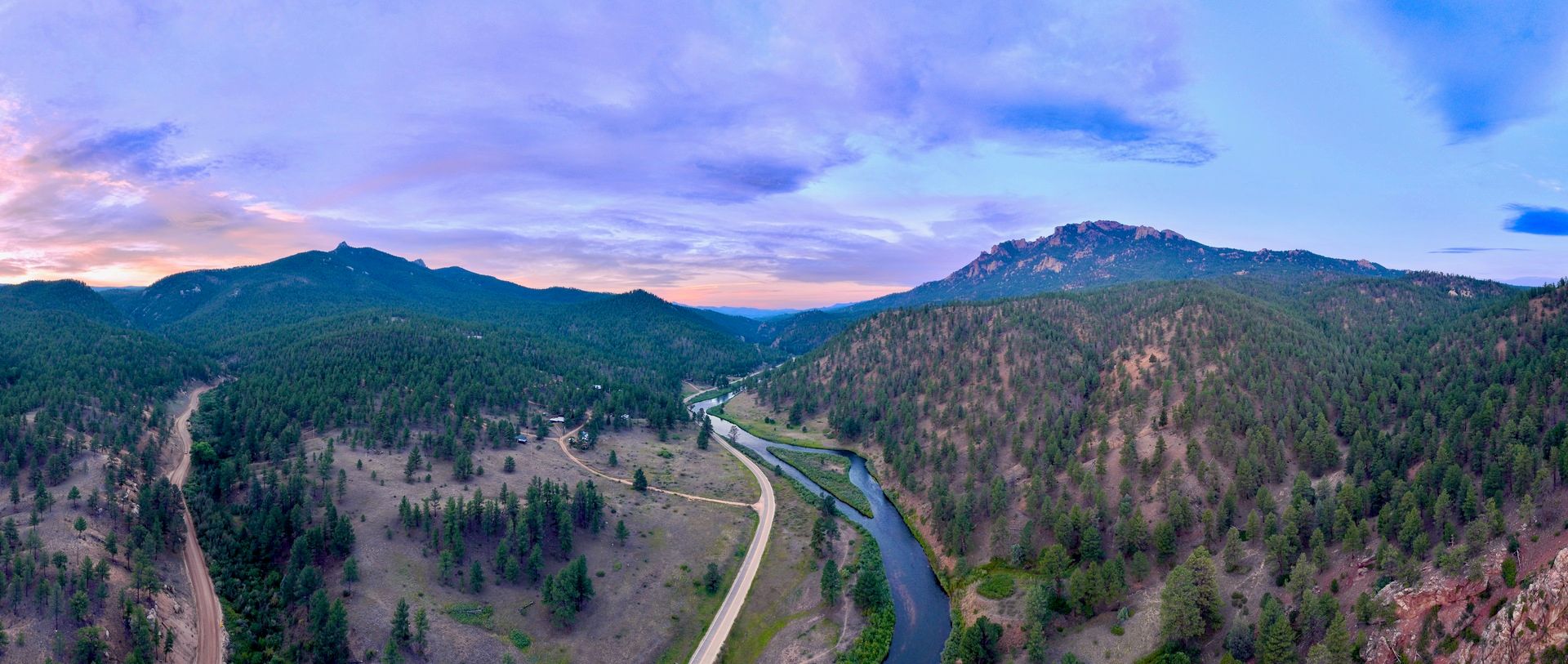 In addition, the drones can fly pre-programmed patterns that I can turn into panoramas like the one above as well as below. When I reached Two Forks, after the sun had risen and shone on the Platte River, there was also my first contact with commercial vehicles and other visitors. There were people in the campgrounds, and of course, the private property to the north and east. but for a while, I was in my own little world.
