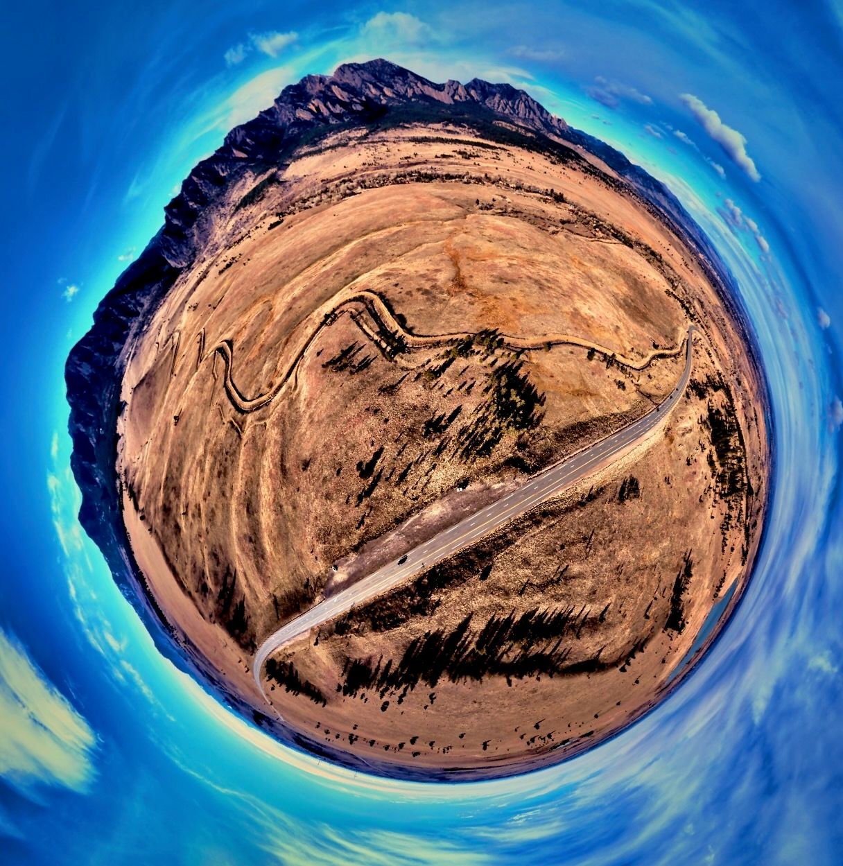 Panorama of the Flatirons viewed from over Highway 93, 31 December 2024