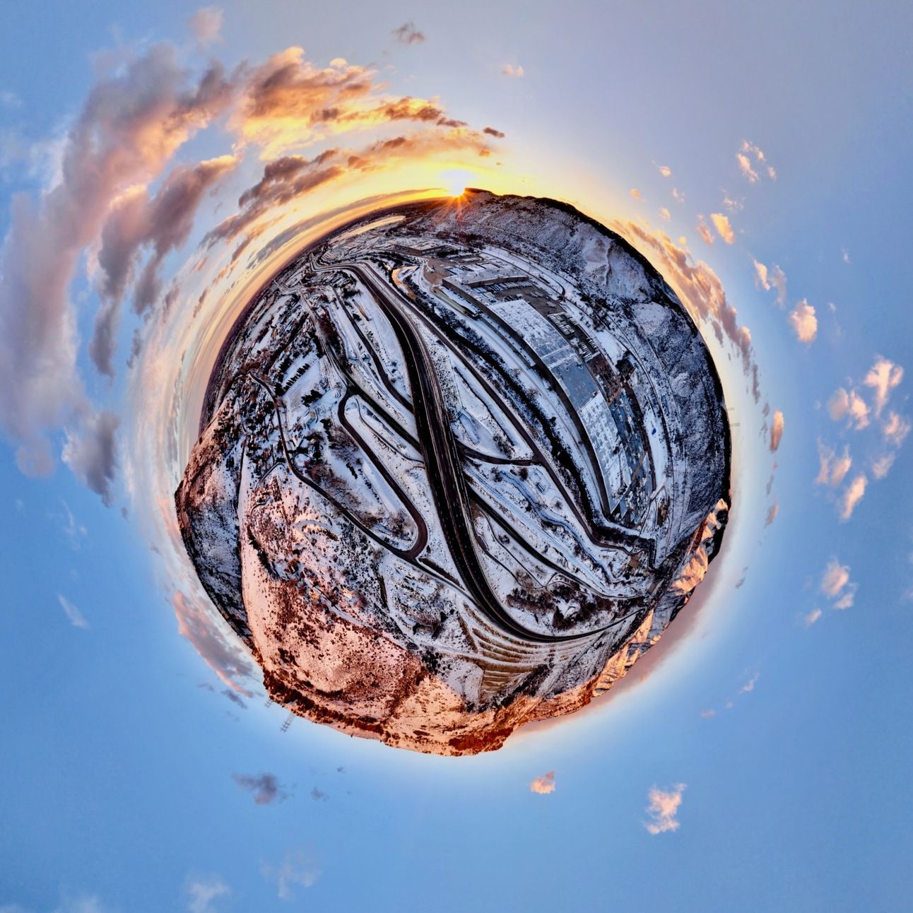 Golden is at the top of this Tiny Planet taken at sunrise with a DJI Mavic 2 Zoom.