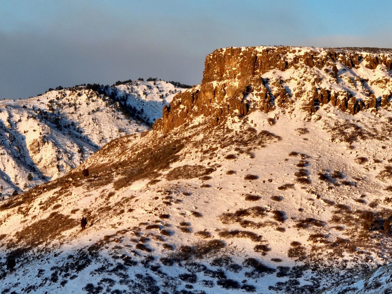 Once again, dark clouds were approaching, and the weather forecast was for one day of clear and warm weather before seasonal snow would settle in for the weekend. Snow from the last round of storms still covered the ground on North Table Mountain, but I could only view them from a distance using a telephoto lens to magnify the details. I read recently that there is a herd of elk currently living on Green Mountain, south of South Table Mountain, so I thought I might see some animals here, too, from a distance, but I was only able to capture rocks, snow and sky.