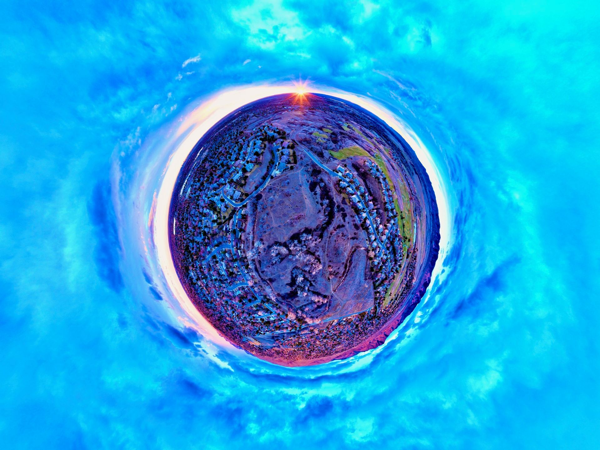 360° panorama of Hutchinson Park at sunrise beneath turquoise clouds.