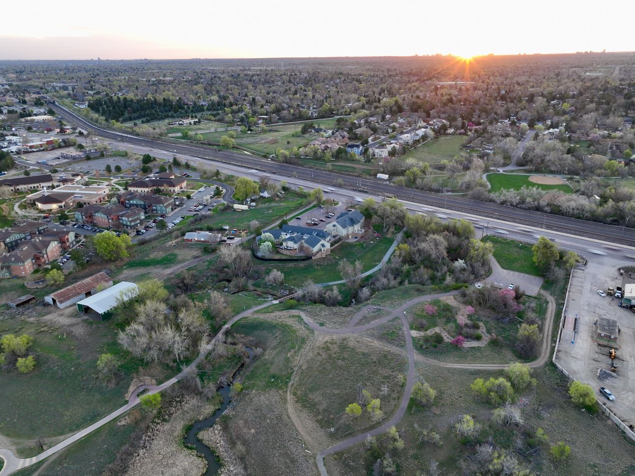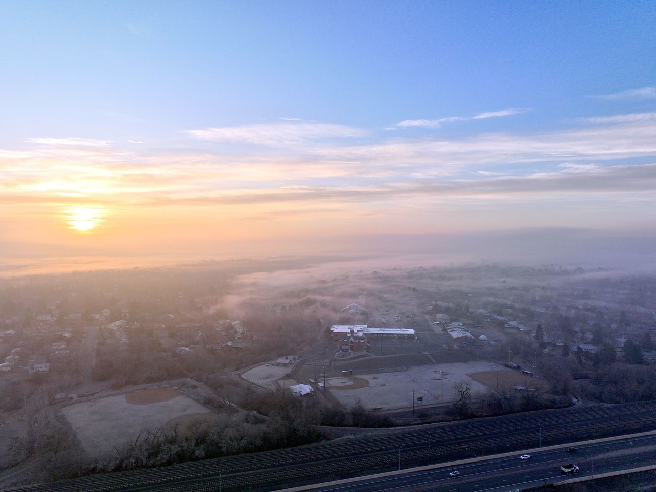 Sunrise over Lee Gulch Overlook Park in Littleton, showing Santa Fe Drive