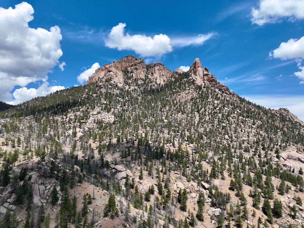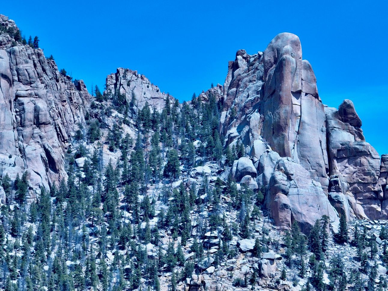 From the south, the exposed rocks of the Spires tumble down the hillside—in geological time, that is. The northern slopes are shaded, keeping moisture longer, while the southern slopes weather the extreme sunlight.