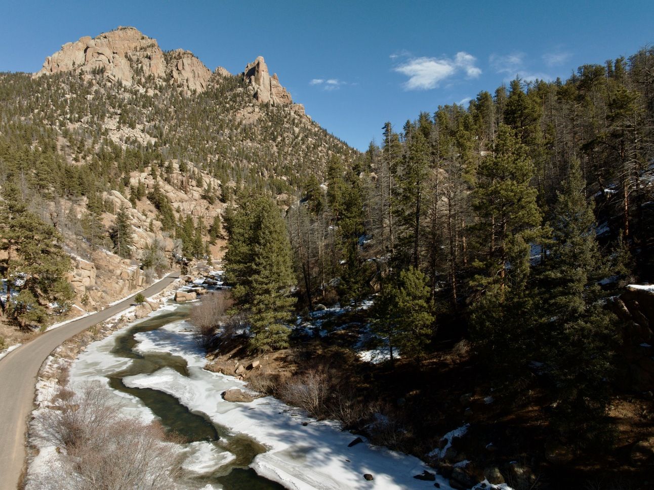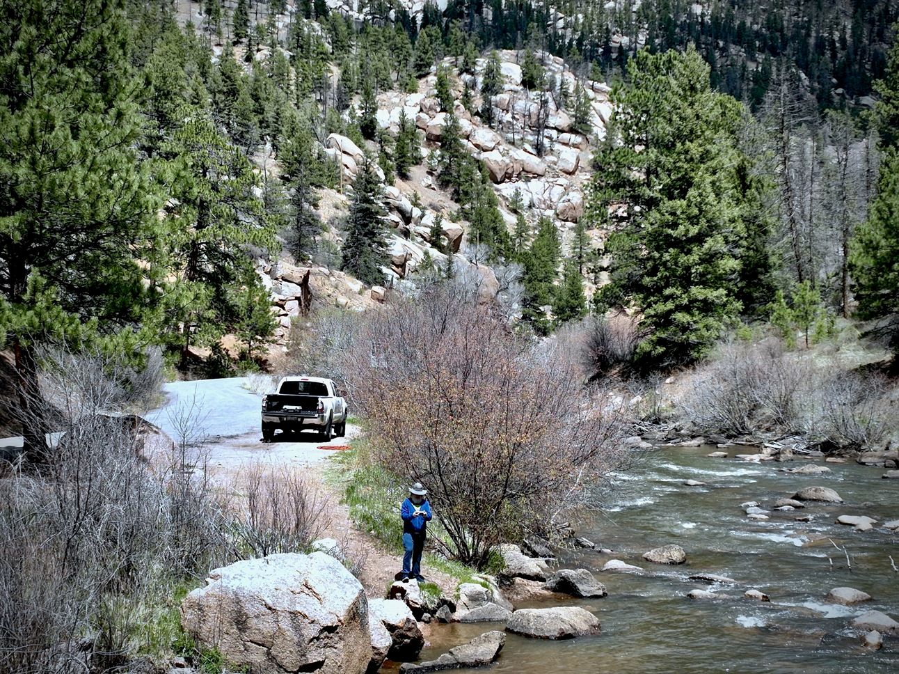 I was joined by a motorcycle rider who stopped briefly on his weekly trip from Evergreen to Woodland Park. I apologized for the noise of the drone, but he said he had already had lost track of it until I pointed out that the drone was flying about 100 feet above us. However, the rustle of the trees in the wind and the splashing of the river became an audible drone to mask the sound of the electronic one in the air.