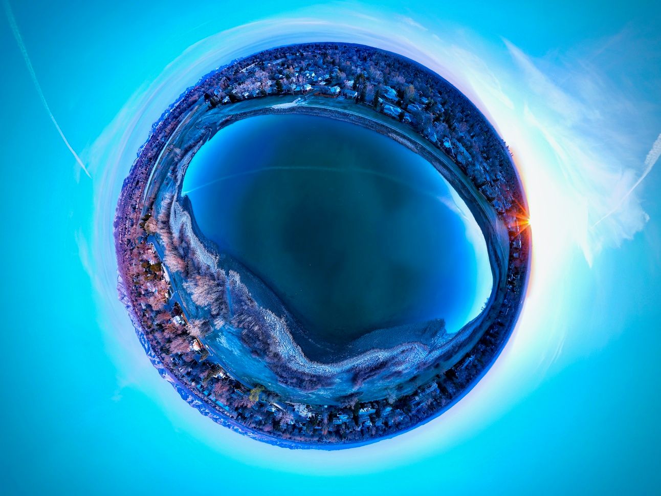 360° Panorama from over East Reservoir at sunrise in the style of a Tiny Planet.